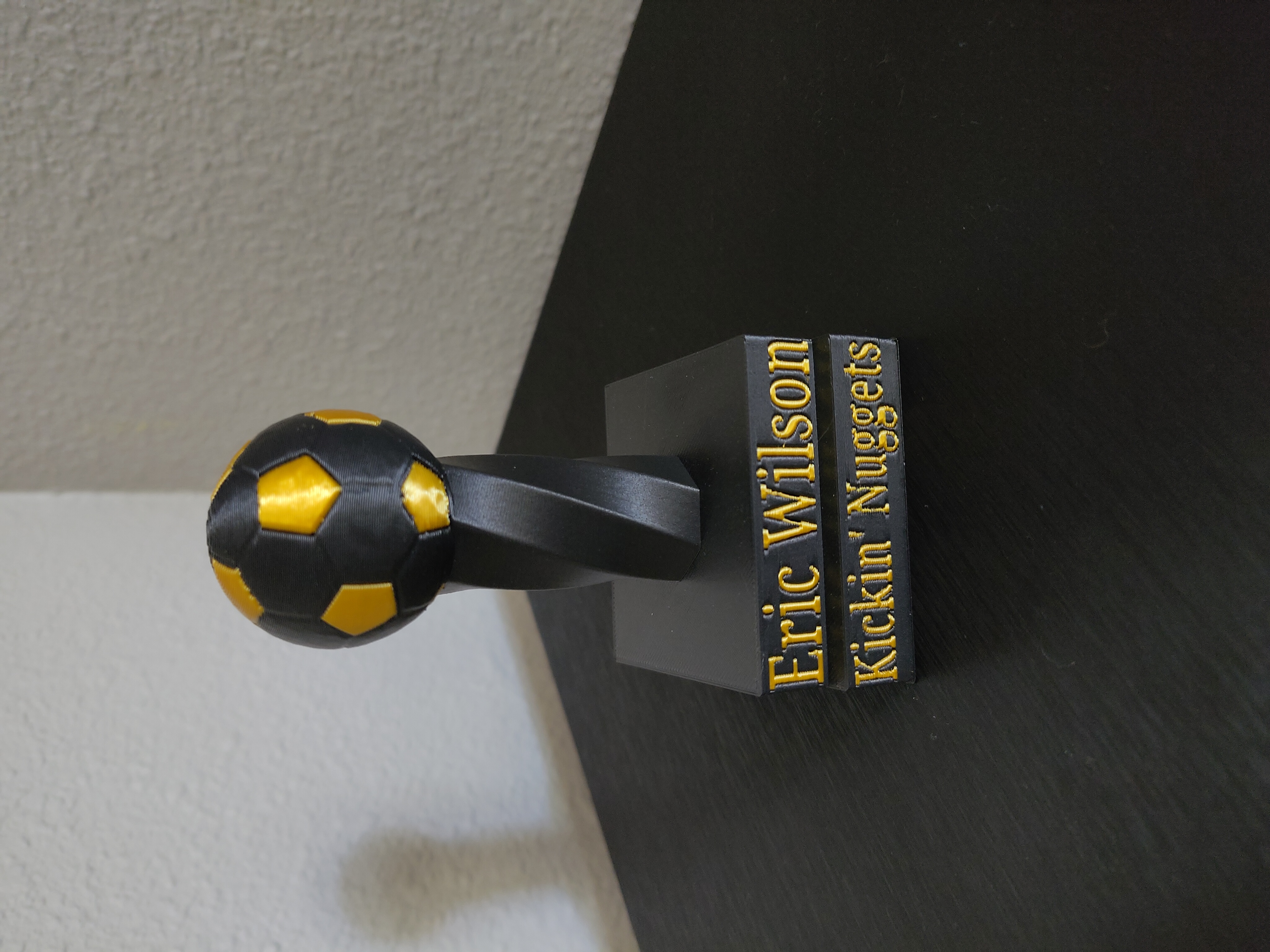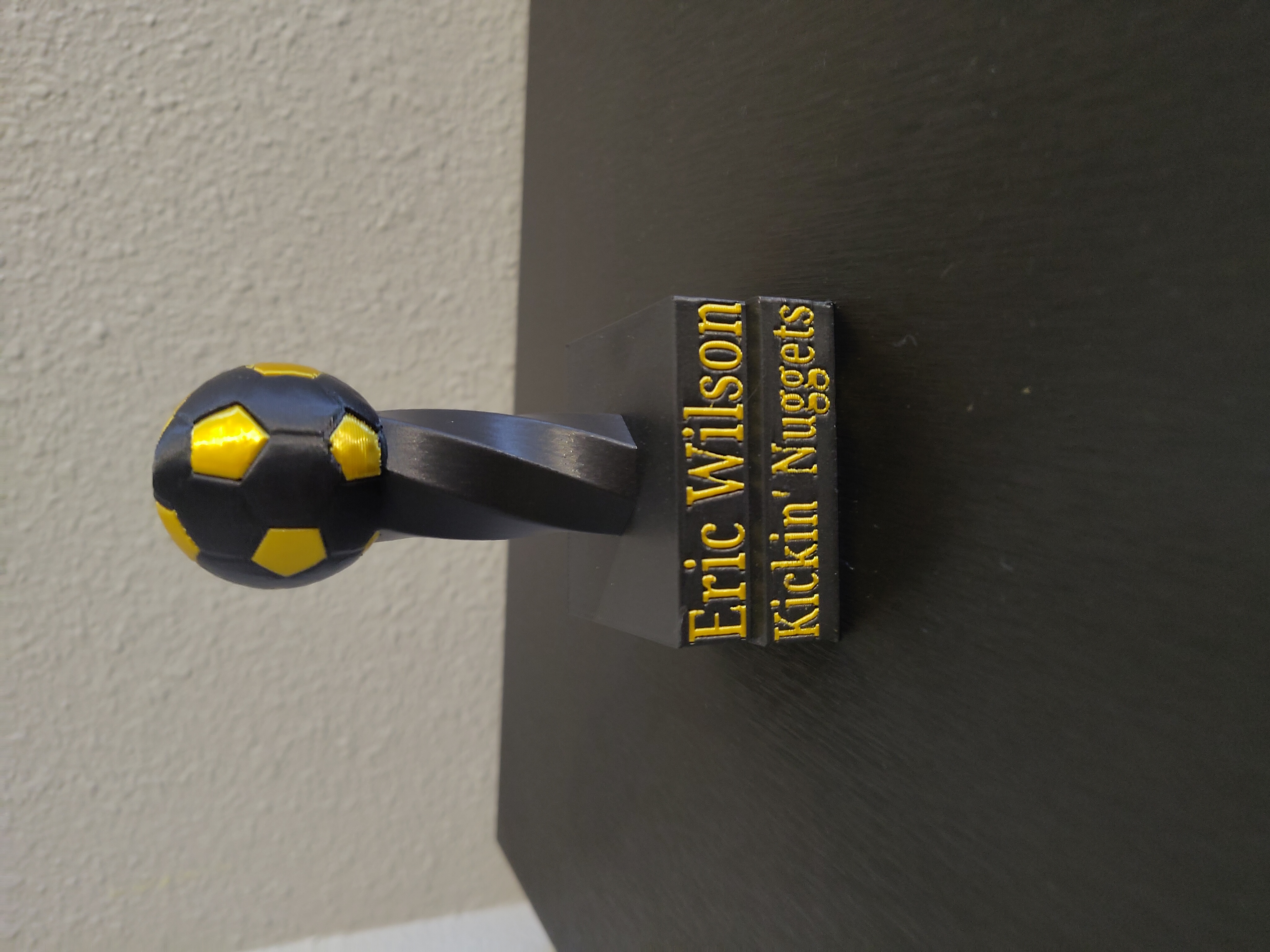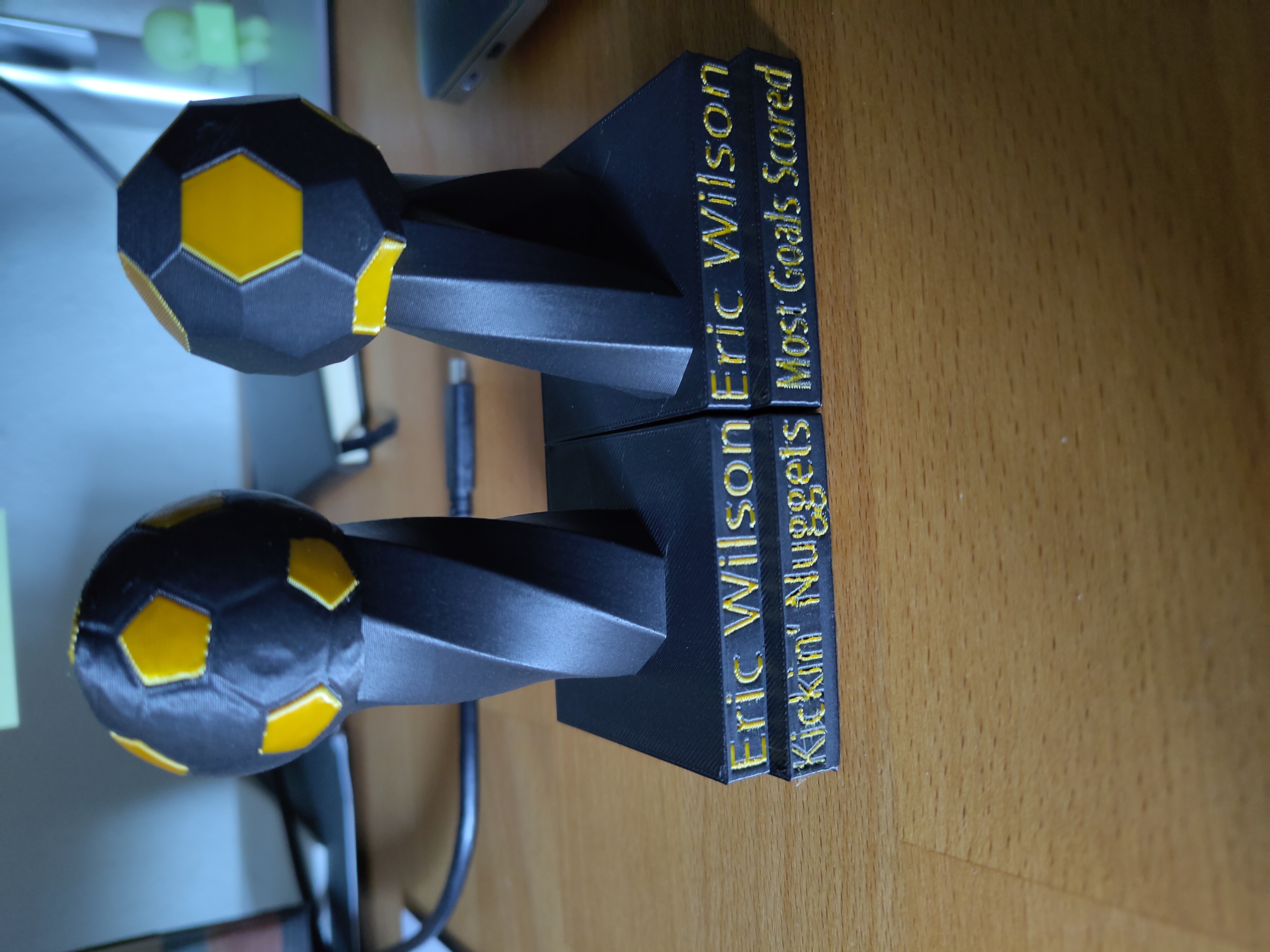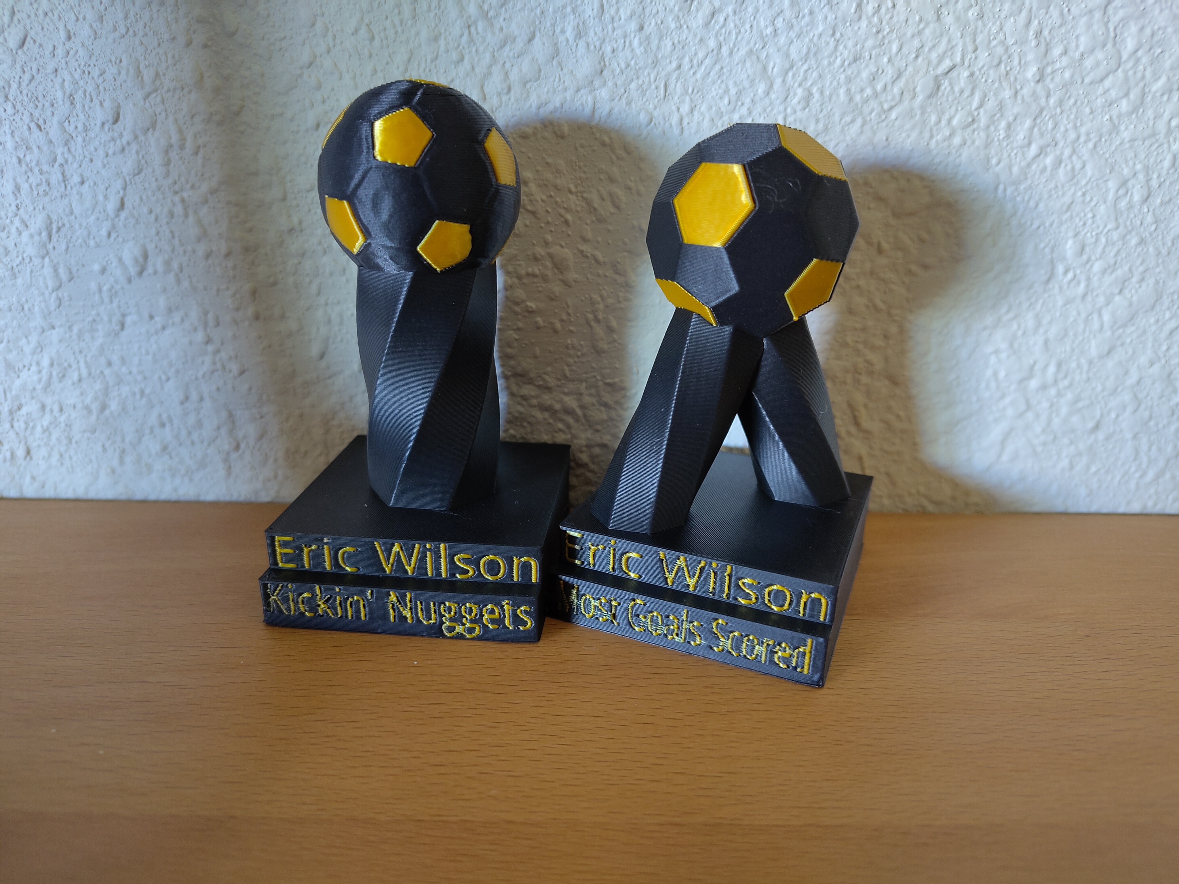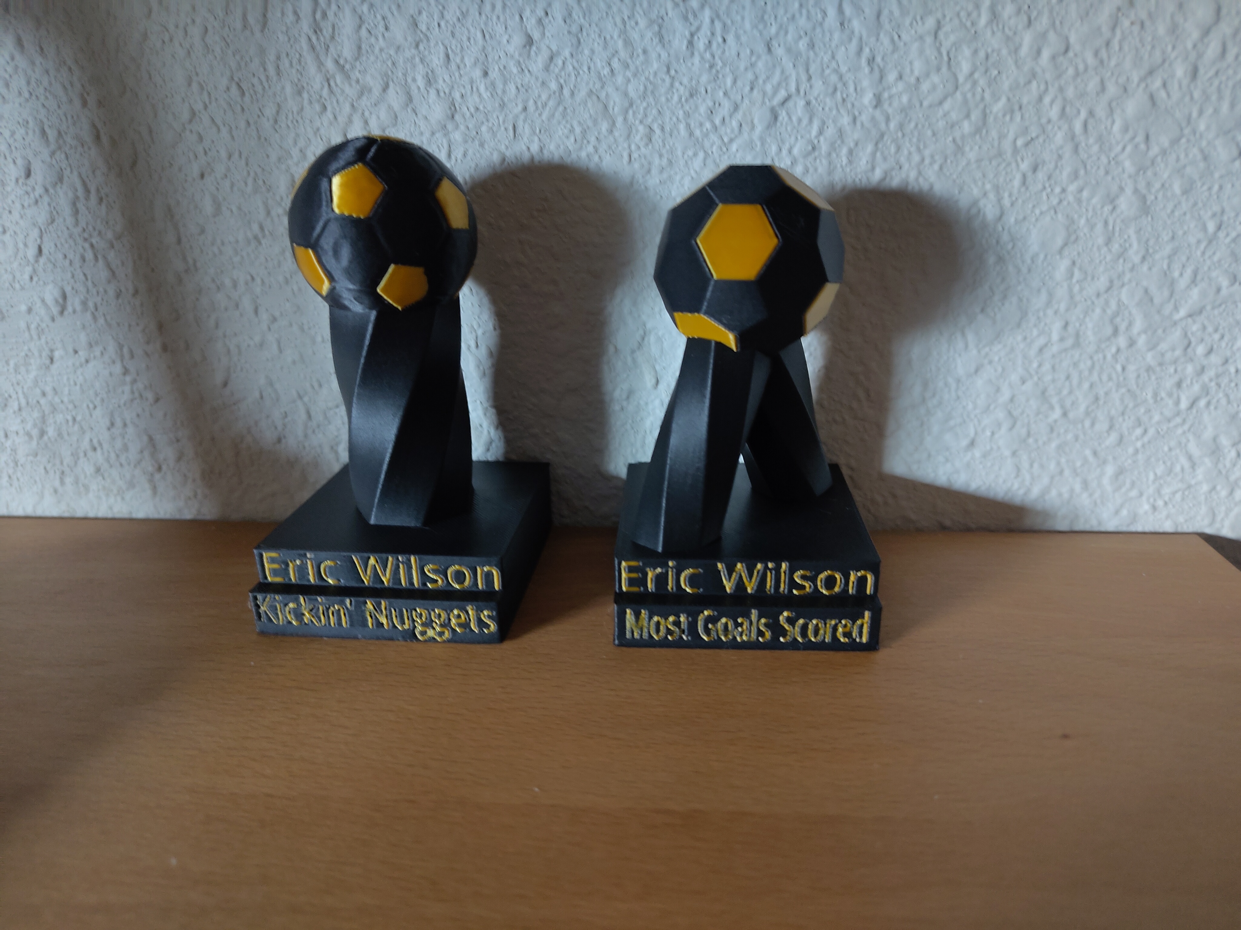 Printed using durable PLA plastic, these trophies are light but solid, perfect for desks, shelves, party tables, or handing out at the end of a soccer season.