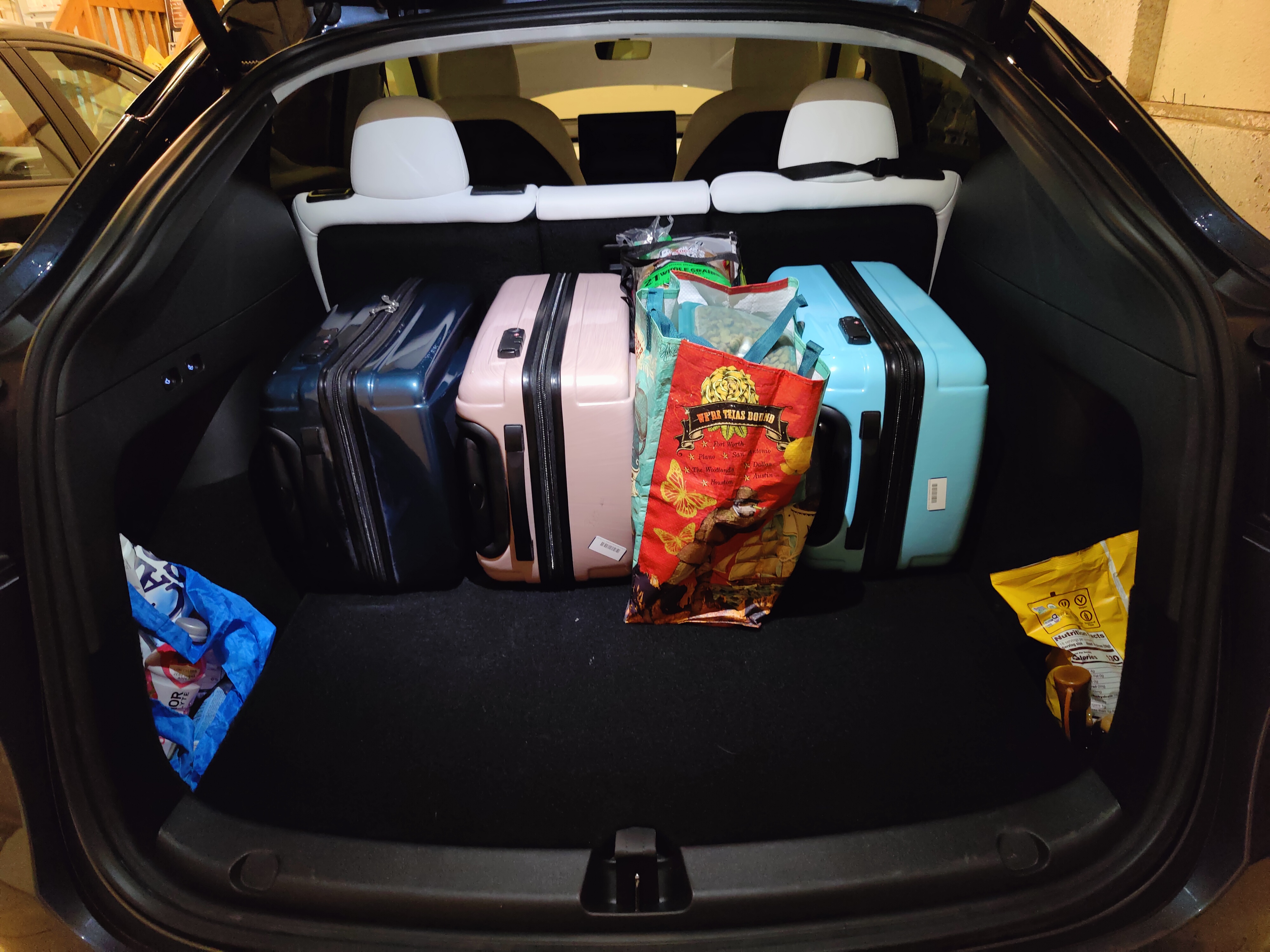 We spent 4 nights skiing this winter and above is the Tesla Model Y packed for the Airbnb. (Not photographed), myself, the dog, wife and kid which all fit, with minimal complaints. When we picked up the skis, we put them right down the middle and moved the suitcases around them, which I forgot to take a picture of.