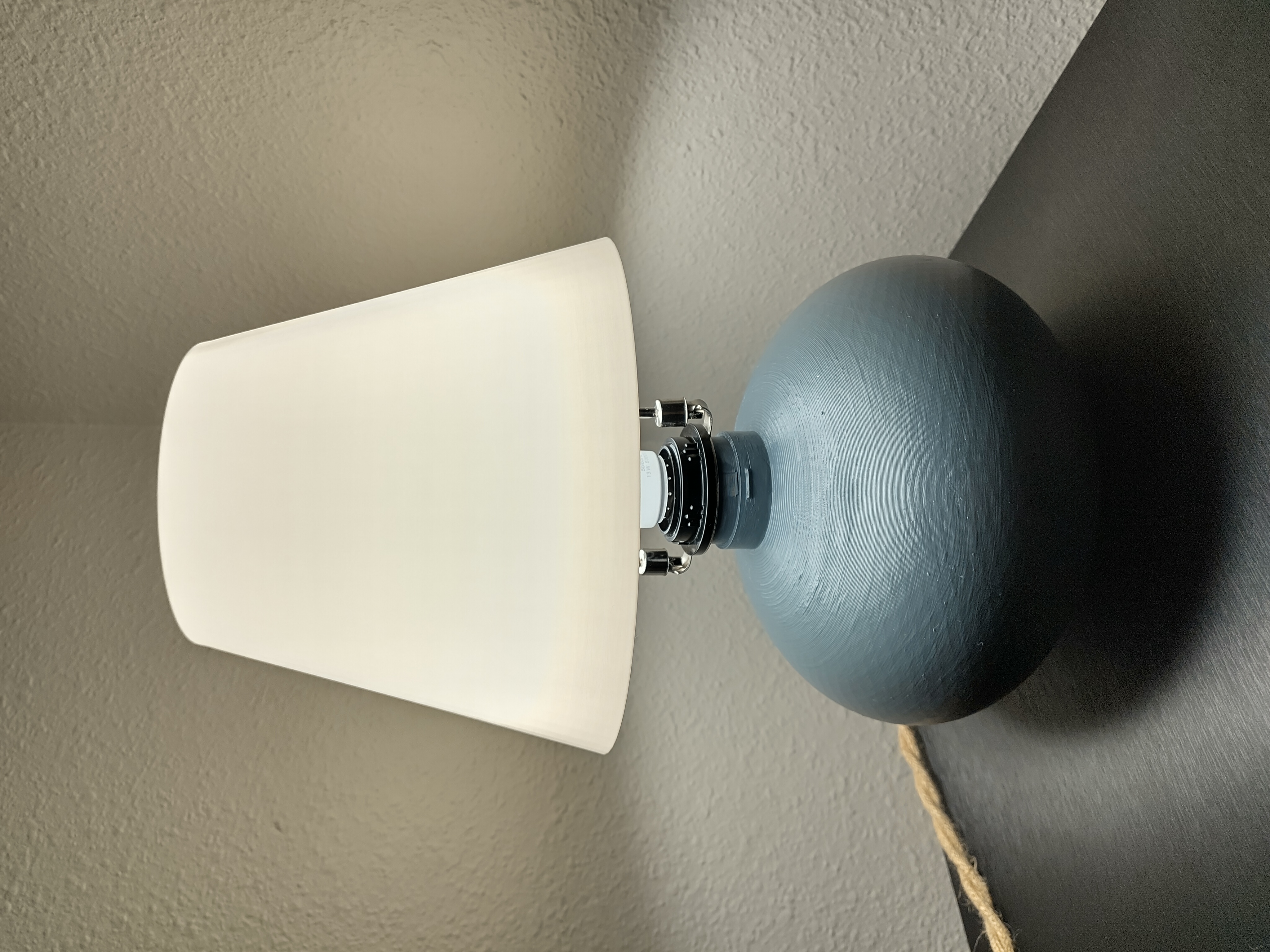 I call it the Soft Glow—a small table lamp with a smooth, hand painted, slate-blue oval base and a crisp white shade. Both parts are 3D printed. I designed the base and lamp shade from scratch, designed a small bracket to connect the bulb socket, and assembled the rest by hand. It plugs into the wall with a simple inline switch, and it works with any standard LED bulb.